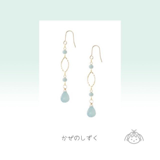 かぜのしずく やわらかな風が、そっと落としていったしずくのように。 透明感あふれるシーブルーカルセドニーと、 ミントグリーンのガラスビーズが、耳元でやさしく揺れるピアスです。 繊細なマーキスフープが光を受けてきらりときらめき、 風にゆらめく葉のような、自然のやさしさを感じられるデザインに。 ナチュラルコーデにも、シンプルなお洋服にも、 さりげなく寄り添ってくれるアイテムです。 ✦ 写真は着用イメージです。サイズ感や色合いの参考にご覧ください。 ✦ ご注文後、monomyより直接発送となります。金具変更などの個別対応は承っておりません。 ✦ 天然石の色や模様には個体差がございます。自然の風合いとしてお楽しみください。 あなたのもとへ、やさしい風のしずくが届きますように。